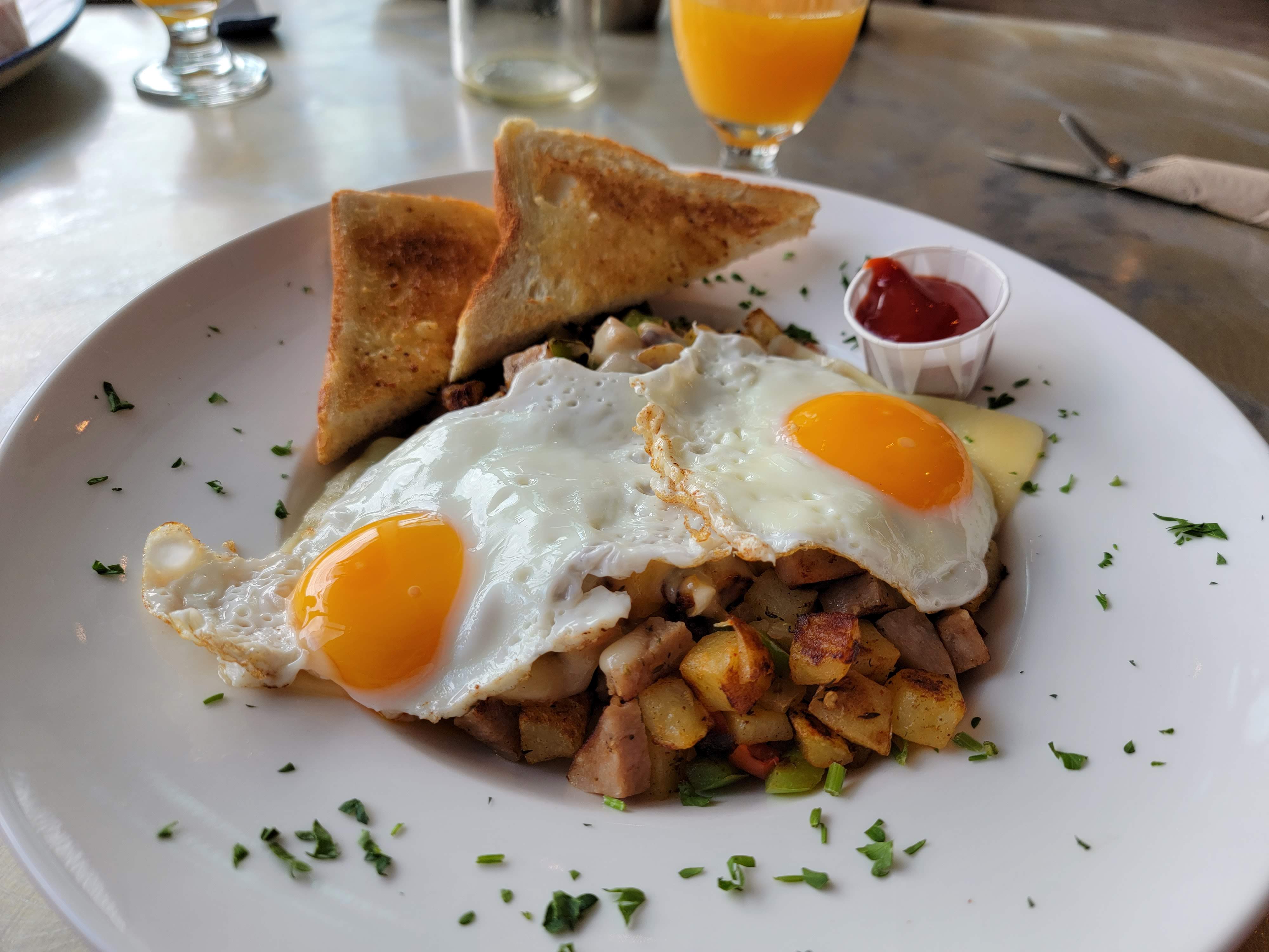 Jus d'orange frais pressé, en dessous des oeufs, patates, saucisses Beyond meat à déjeuner, légumes c'était vraiment très bon surtout après 16 km loll!